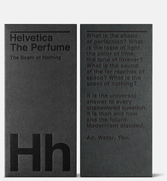 Helvetica The Perfume™. The scent of nothing è ispirato all’omonima font con un odore inodore: così come il carattere tipografico era stato ideato con l’intenzione di apparire il più possibile neutro e non interferire con il significato delle parole scritte, Guts & Glory hanno creato un oggetto che rappresenti il moderno design senza una esplicita “didascalia”, non ci sono messaggi intrinseci, ci sei solo tu e un oggetto di design, il senso emerge da questa interazione.