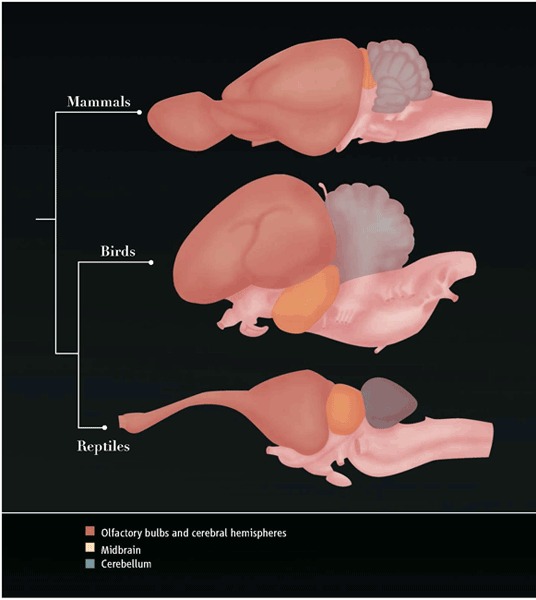 Dimensioni relative di bulbo olfattivo, emisferi, medulla e cervelletto in rettili, uccelli e mammiferi