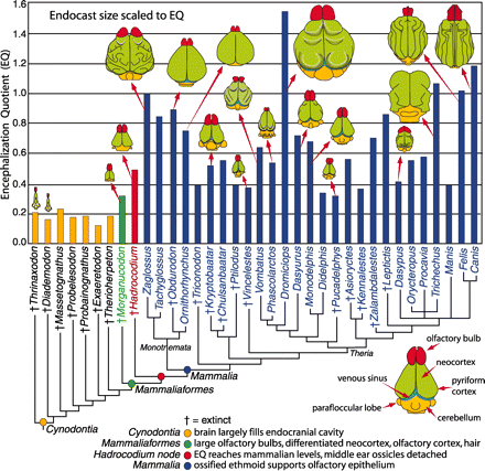 Schema dell’evoluzione del cervello a partire dai cinodonti (in rosso è rappresentato il bulbo olfattivo).