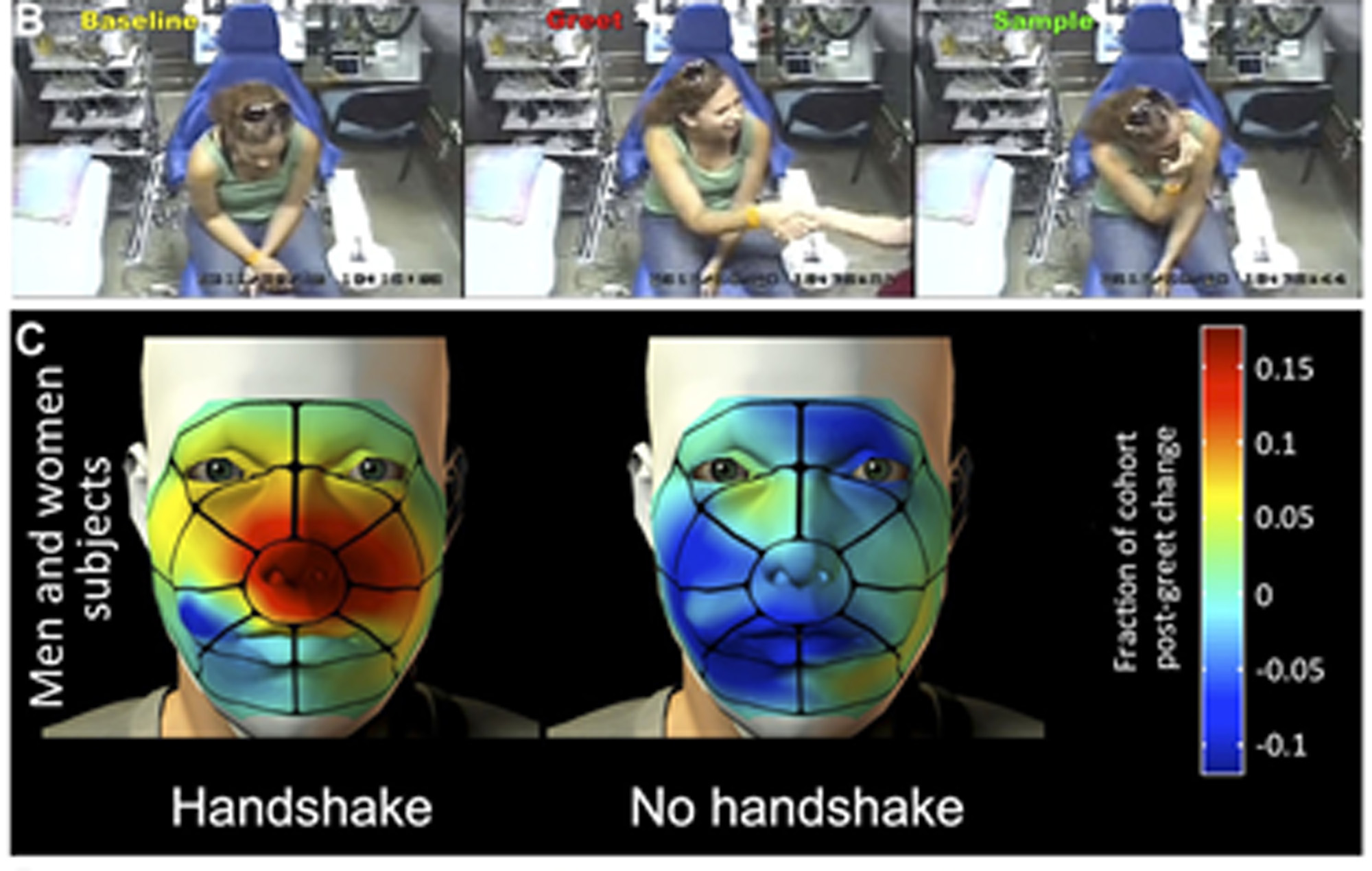 Anche questa volta i volontari aspettano soli in una stanza di laboratorio dove è stata nascosta una telecamera*. Dopo tre minuti da soli i soggetti ricevono la breve visita di un membro del laboratorio che in 20 secondi li saluta stringendo loro la mano, oppure no, e poi esce di nuovo. I ricercatori hanno osservato grazie ai filmati il comportamento dei volontari prima e dopo la stretta di mano misurando il tempo che ognuno di loro passava toccandosi il naso o l’area della faccia vicina. Hanno quindi confrontato i tempi tra i due gruppi di persone, quelli che avevano ricevuto la stretta di mano dallo sperimentatore e quelli, come controllo, che avevano avuto solo una comunicazione verbale.